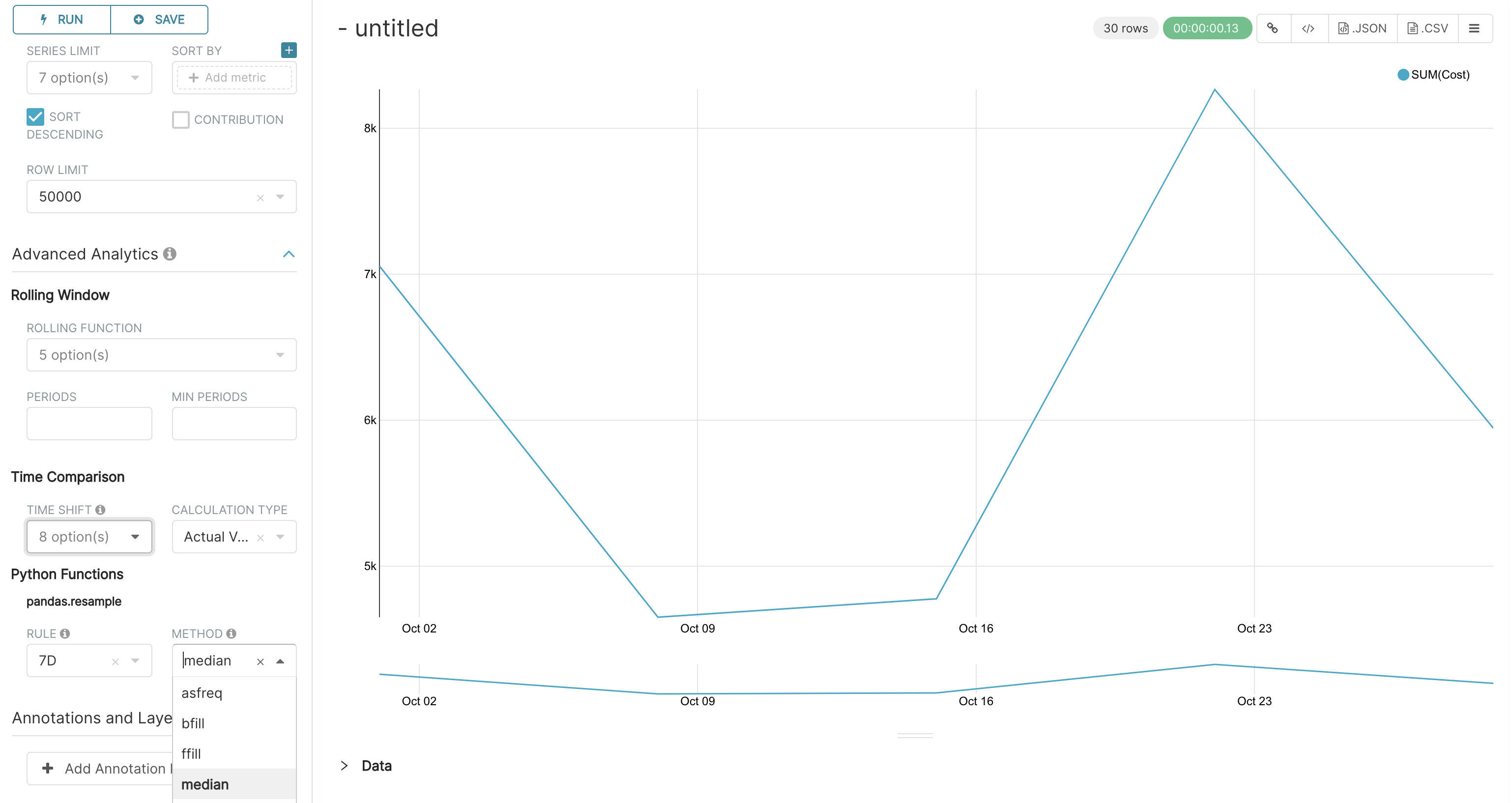 Next, in the Python Functions subsection of Advanced Analytics, enter 7D, corresponding to seven days, in the Rule and median as the Method and show the chart by selecting Run Query.